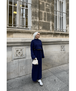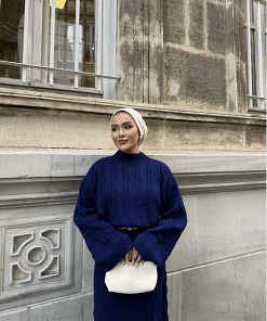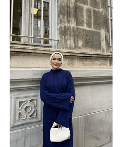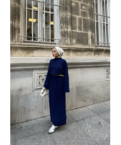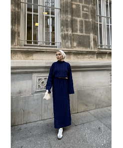 Deze blauwe gebreide maxi jurk is een tijdloze en comfortabele optie voor vrouwen die houden van modest fashion met een casual chic uitstraling. De zachte gebreide stof voelt aangenaam aan en biedt een comfortabele pasvorm, geschikt voor dagelijks gebruik of werk.