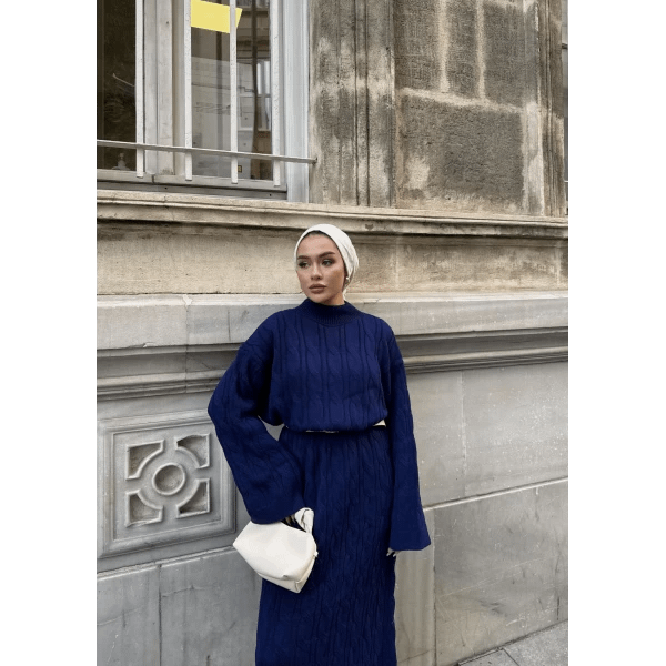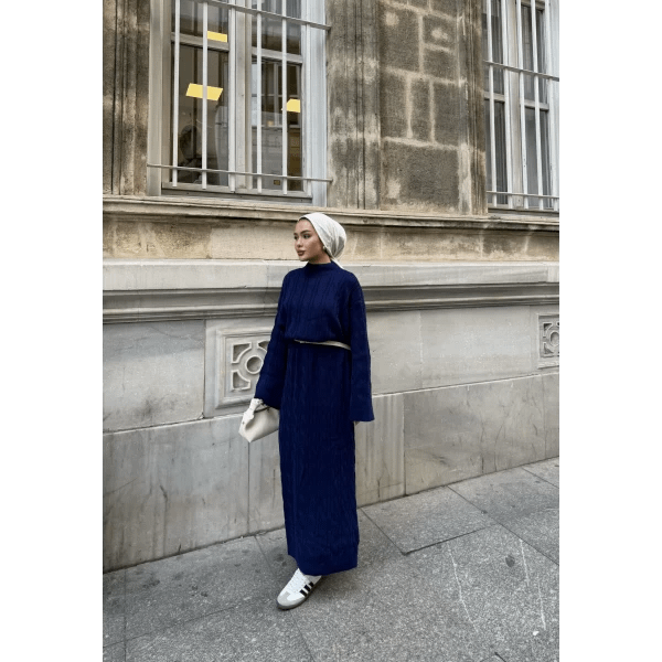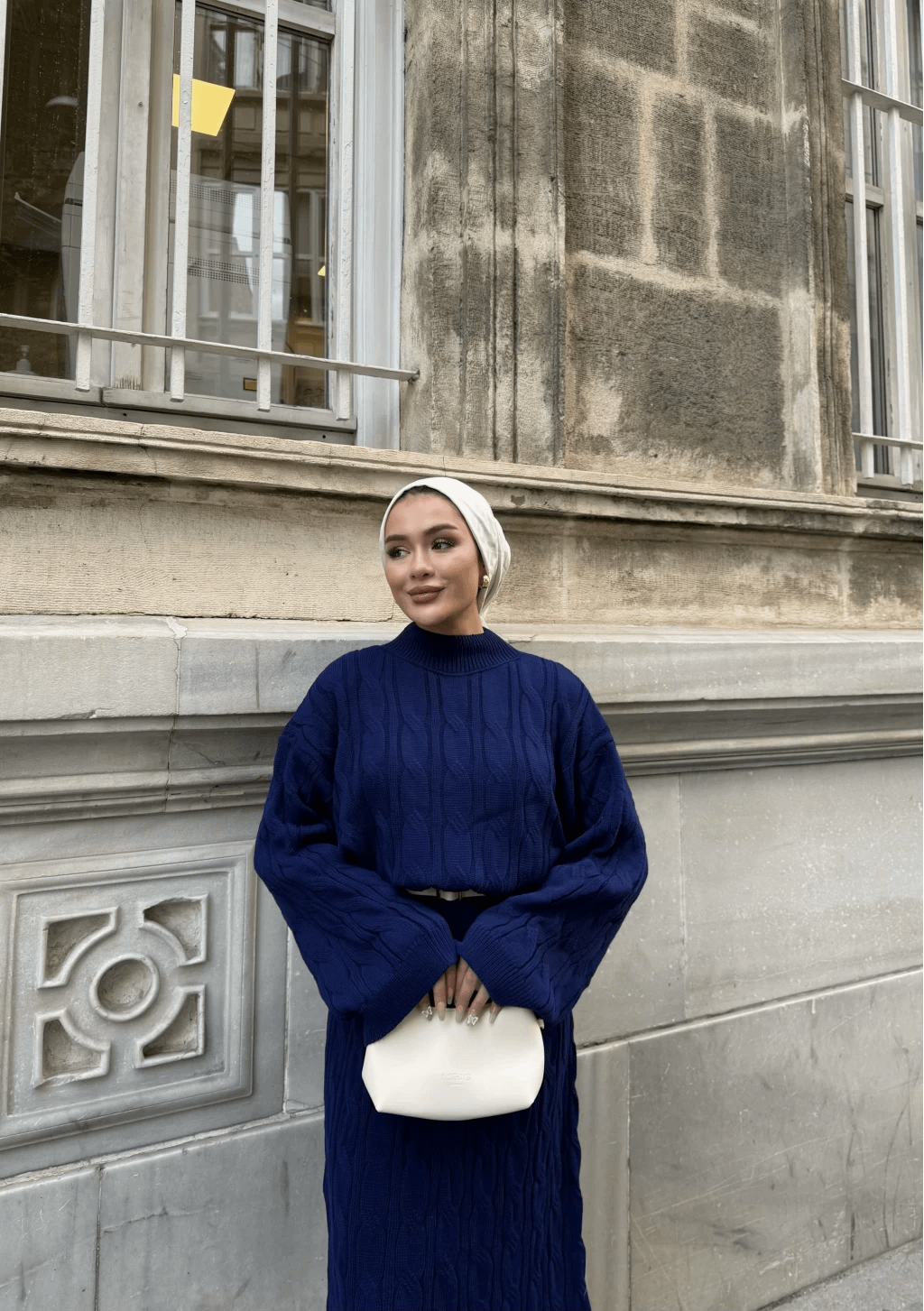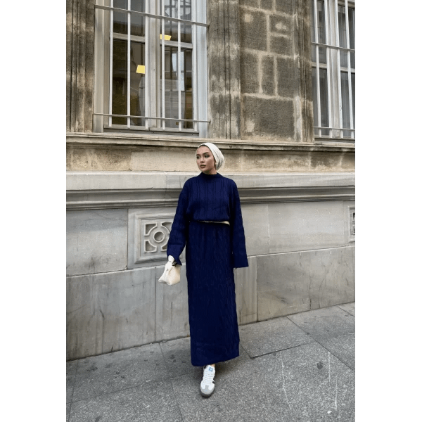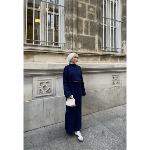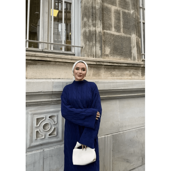 Deze blauwe gebreide maxi jurk is een tijdloze en comfortabele optie voor vrouwen die houden van modest fashion met een casual chic uitstraling. De zachte gebreide stof voelt aangenaam aan en biedt een comfortabele pasvorm, geschikt voor dagelijks gebruik of werk.