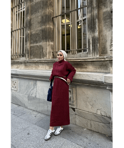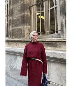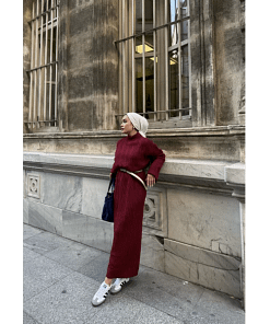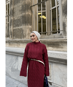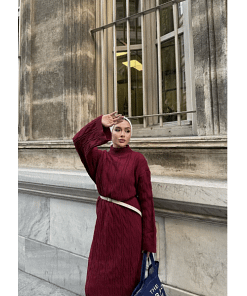 Deze bordeaux gebreide maxi jurk combineert comfort en elegantie met een modest en verfijnde uitstraling. De zachte stof voelt prettig aan en biedt voldoende stretch voor een comfortabele pasvorm. Dankzij de maxi-lengte en bescheiden ontwerp is deze jurk ideaal voor werk, feestjes of dagelijkse afspraken.