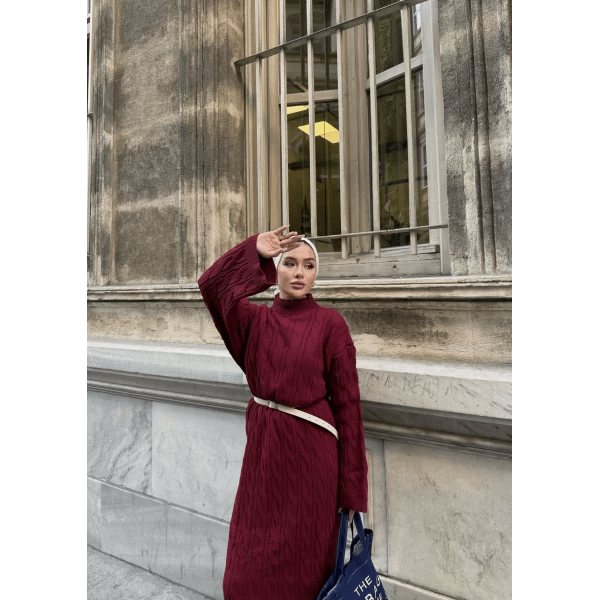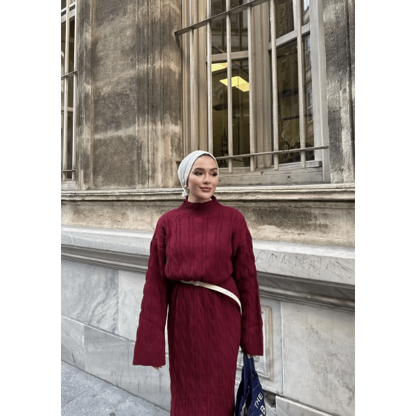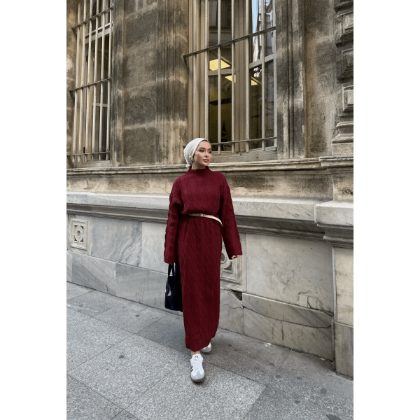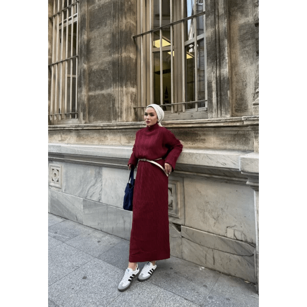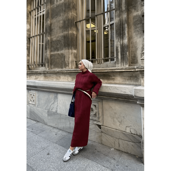 Deze bordeaux gebreide maxi jurk combineert comfort en elegantie met een modest en verfijnde uitstraling. De zachte stof voelt prettig aan en biedt voldoende stretch voor een comfortabele pasvorm. Dankzij de maxi-lengte en bescheiden ontwerp is deze jurk ideaal voor werk, feestjes of dagelijkse afspraken.