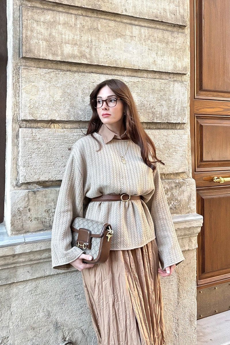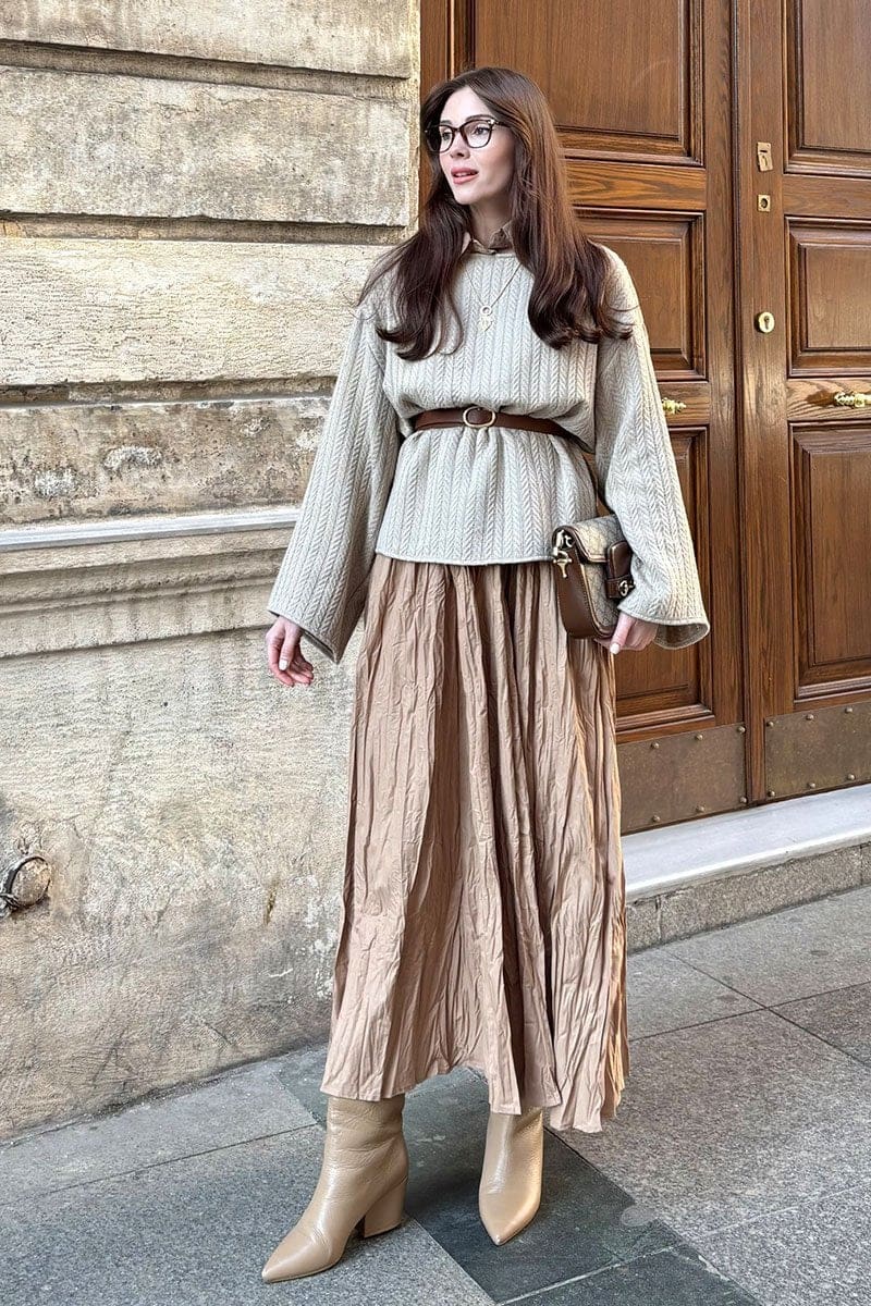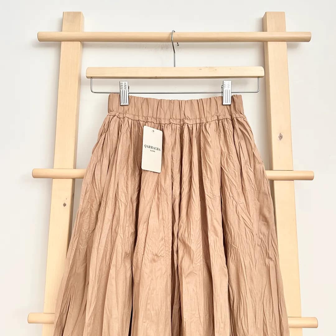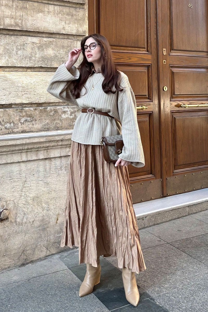 Deze gekreukelde rok in zandbruin heeft een natuurlijke en elegante uitstraling. De subtiele kreukstructuur geeft de rok karakter en zorgt voor een speels effect, terwijl de pasvorm comfortabel en bescheiden blijft.