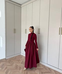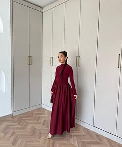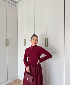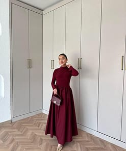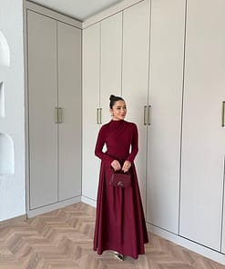 De geplooide jurk in bordeaux is een echte eyecatcher binnen elke modest garderobe. De plooien zorgen voor beweging en elegantie, terwijl de diepe bordeaux kleur een luxe uitstraling geeft.