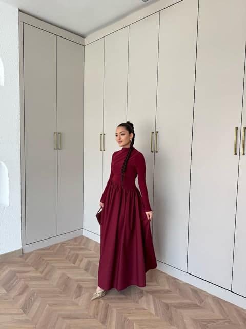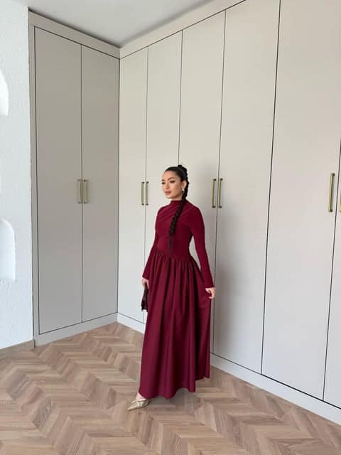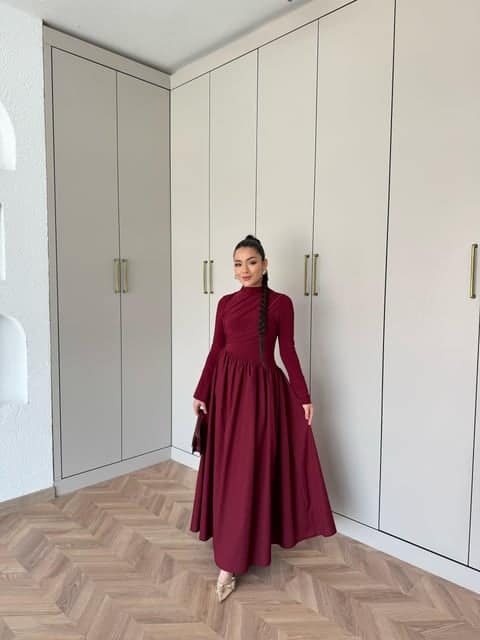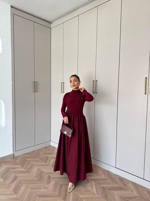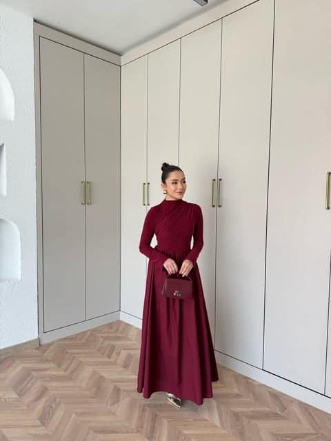 De geplooide jurk in bordeaux is een echte eyecatcher binnen elke modest garderobe. De plooien zorgen voor beweging en elegantie, terwijl de diepe bordeaux kleur een luxe uitstraling geeft.