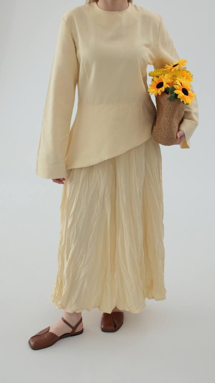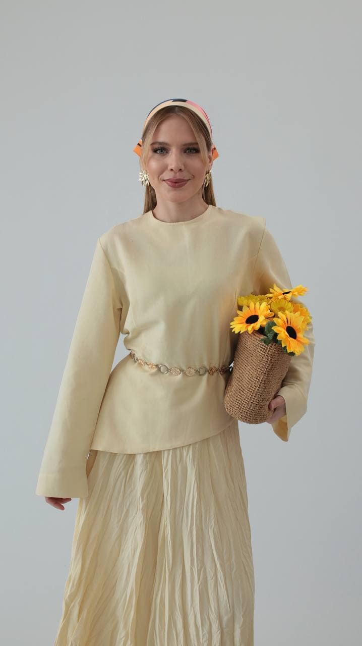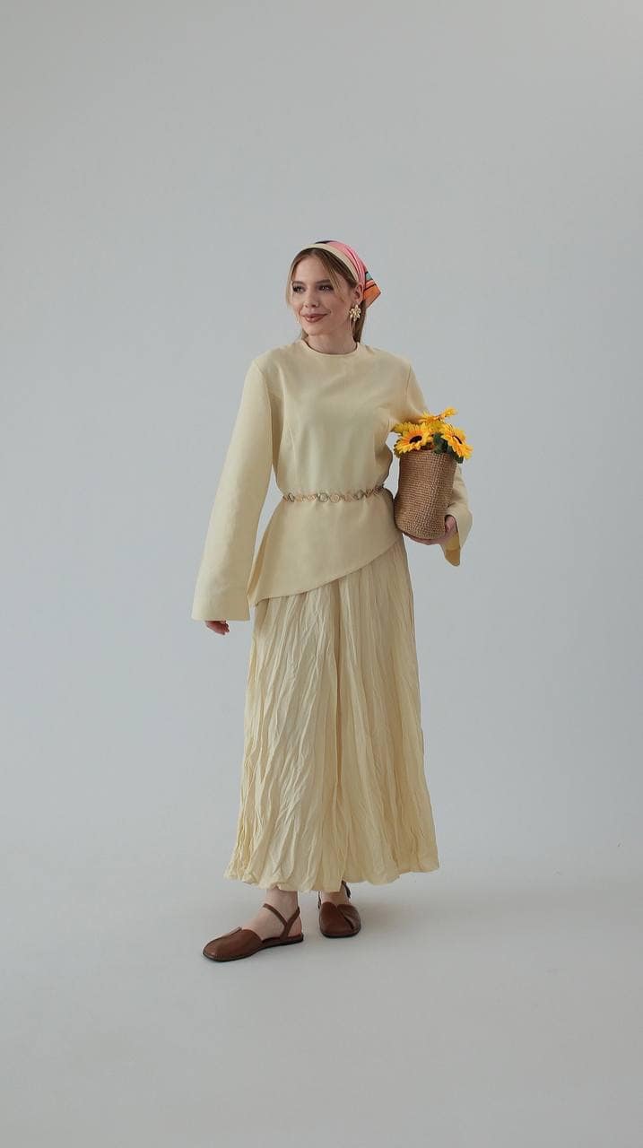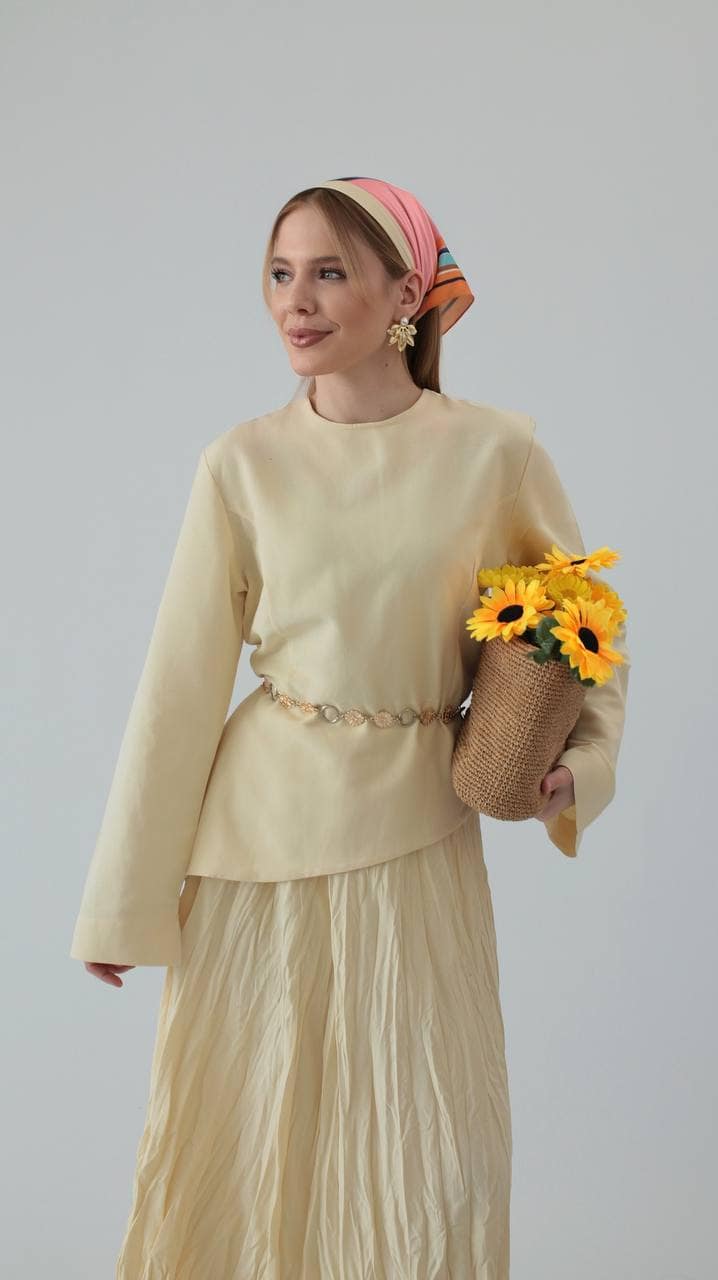 Onze linnen asymmetrische twinset in butter yellow is een frisse en stijlvolle keuze voor de lente en zomer. Het zachte linnen materiaal biedt comfort en ademend vermogen, terwijl het asymmetrische ontwerp een moderne twist geeft aan je modest look.