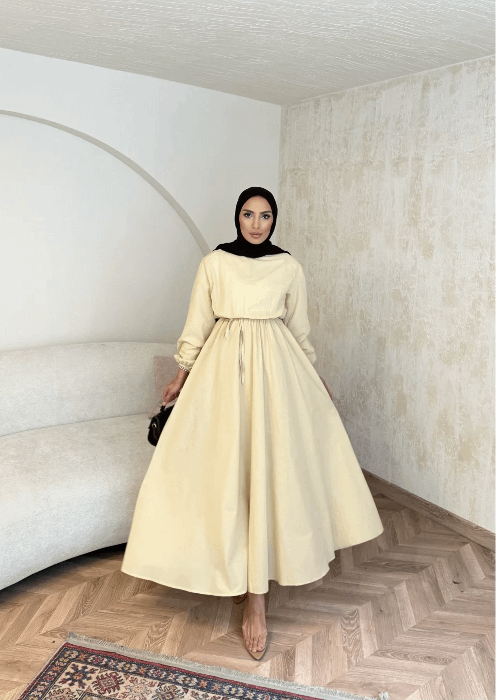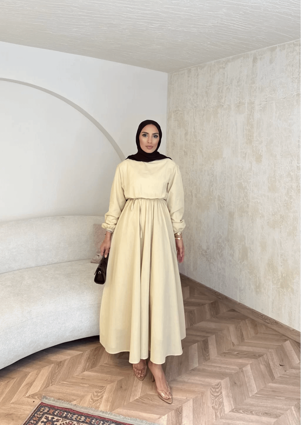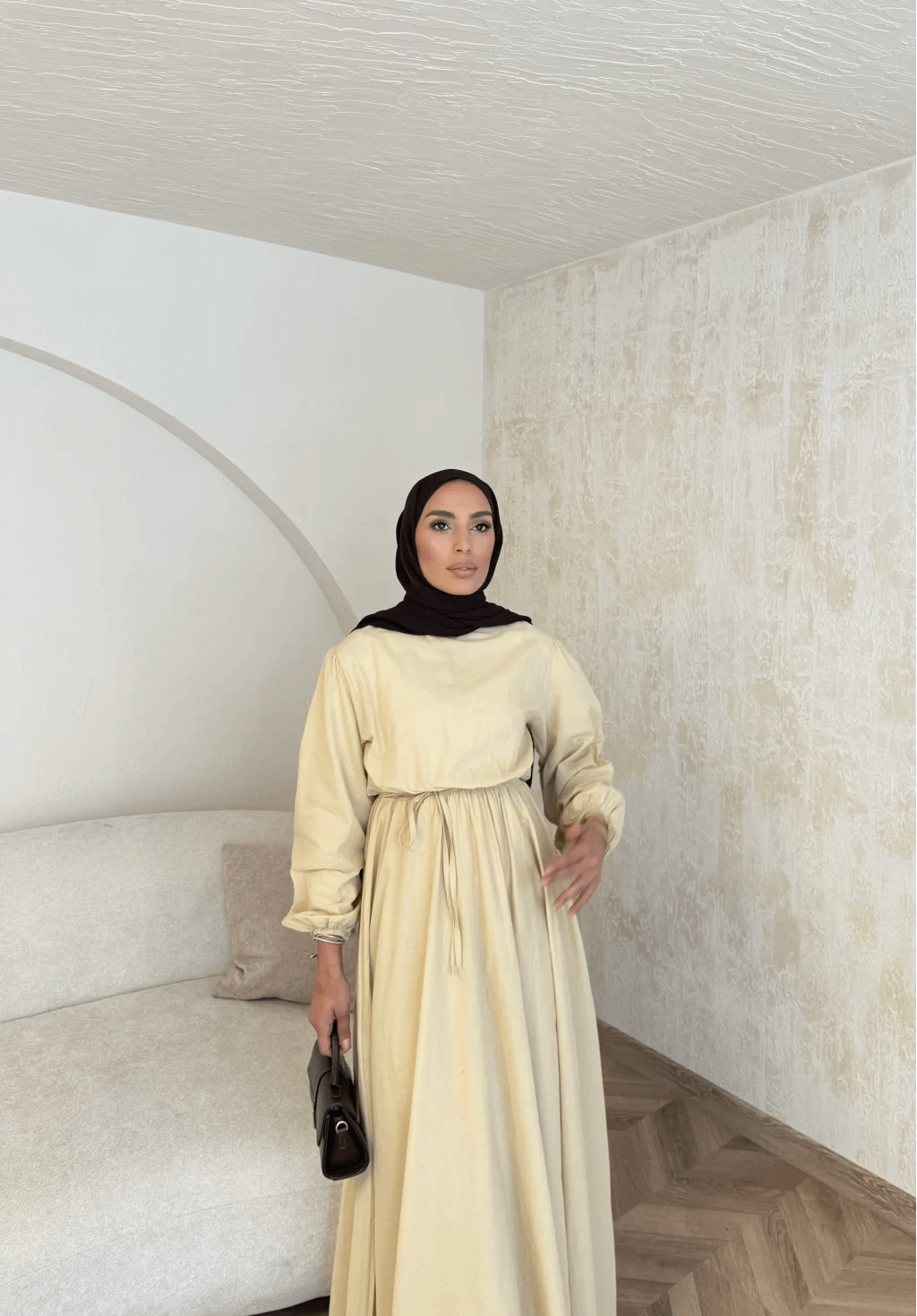 Onze linnen jurk in butter yellow is een lichte, stijlvolle jurk perfect voor warmere dagen. Het ademende linnen materiaal houdt je comfortabel, terwijl de bescheiden pasvorm zorgt voor een elegante, modest look.