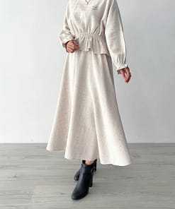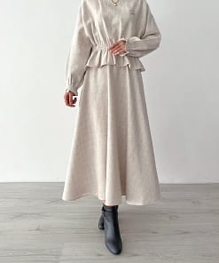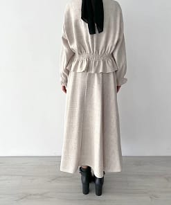 Deze beige tweed co-ord set is een stijlvolle en verzorgde outfit voor vrouwen die houden van modest fashion met een luxe uitstraling. De set bestaat uit een top en bijpassende broek of rok, gemaakt van hoogwaardige tweed stof. Het tijdloze beige maakt de set veelzijdig en eenvoudig te combineren met verschillende accessoires zoals sjaals, riemen of hoofddoeken.