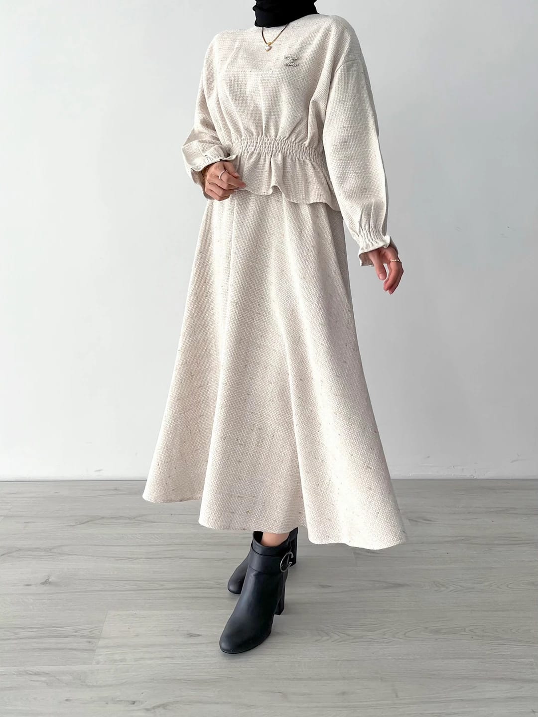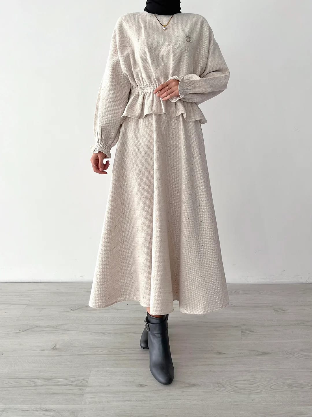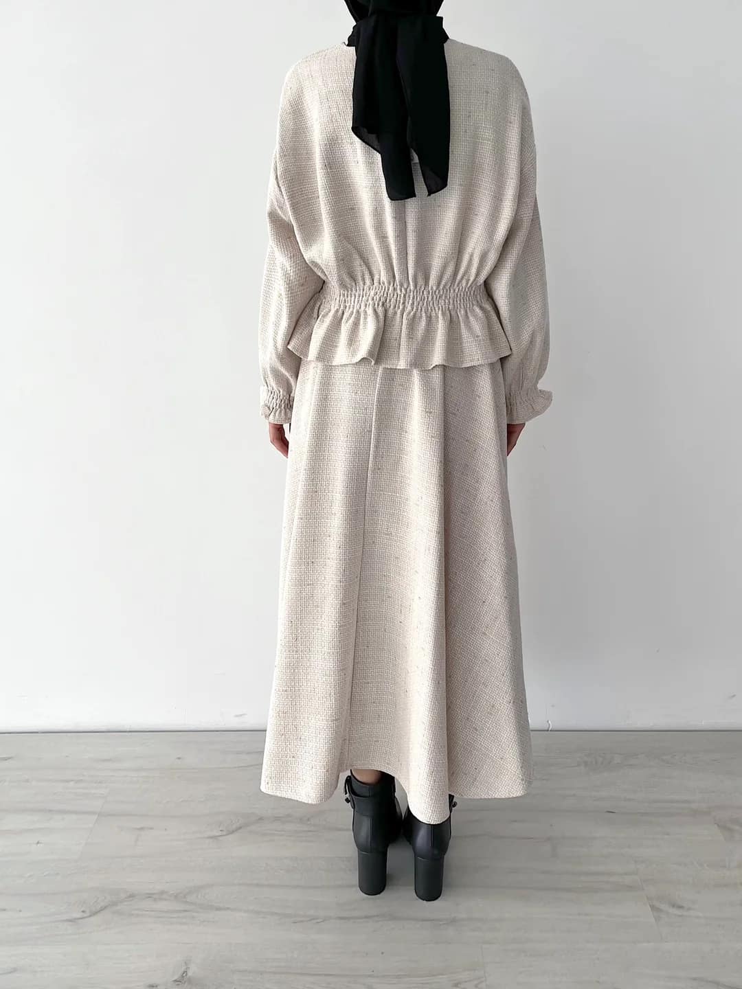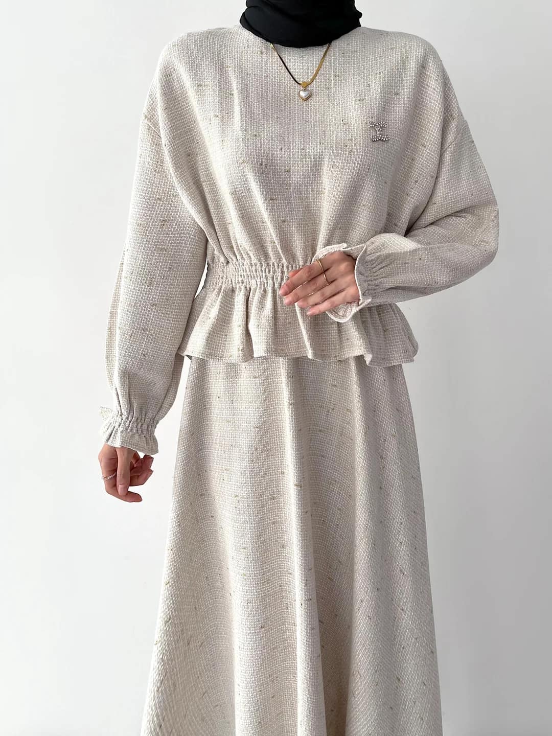 Deze beige tweed co-ord set is een stijlvolle en verzorgde outfit voor vrouwen die houden van modest fashion met een luxe uitstraling. De set bestaat uit een top en bijpassende broek of rok, gemaakt van hoogwaardige tweed stof. Het tijdloze beige maakt de set veelzijdig en eenvoudig te combineren met verschillende accessoires zoals sjaals, riemen of hoofddoeken.